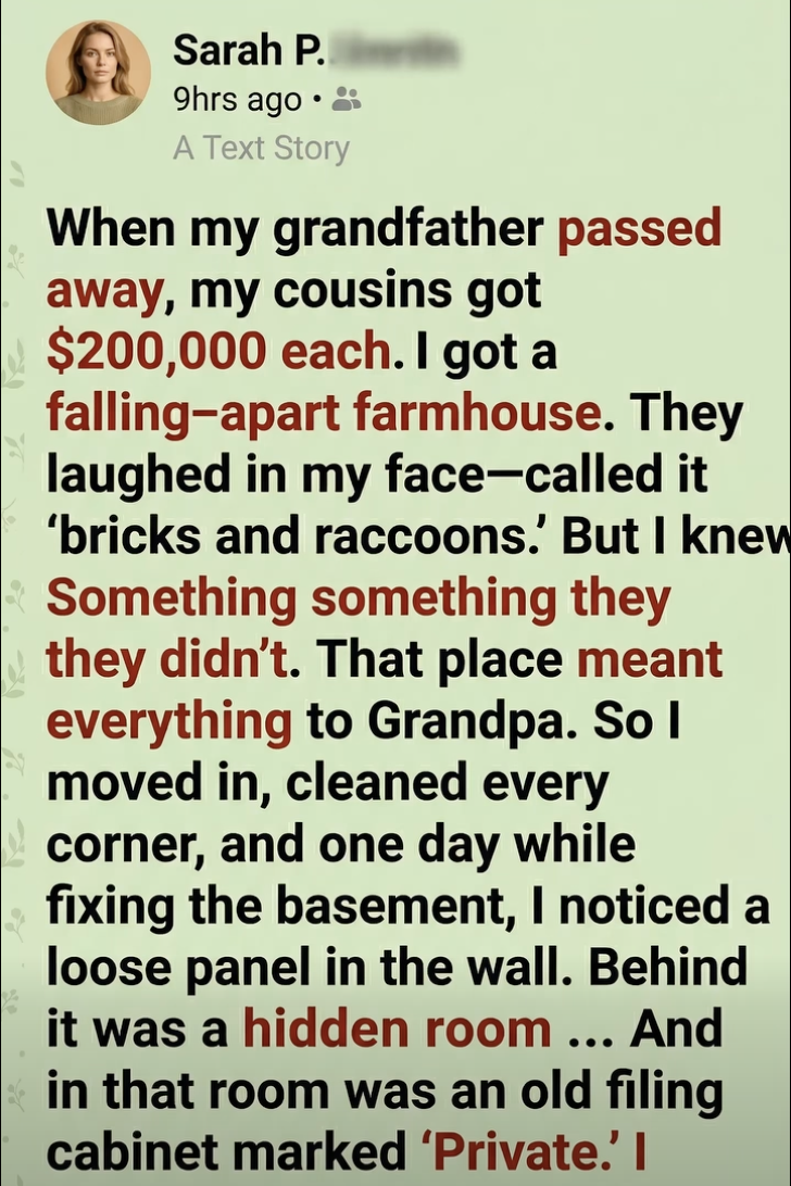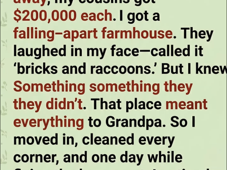 When my grandfather passed away, my cousins walked away with $200,000 each. I got the old farmhouse—the one everyone in the family avoided. The roof sagged, the paint peeled, and raccoons had made themselves at home in the attic. At the reading of the will, they didn’t even try to hide their laughter. “Enjoy your bricks and raccoons,” one of them joked.
