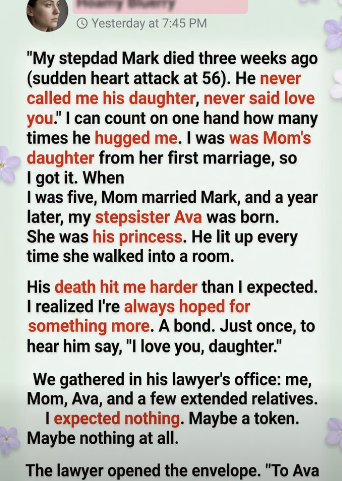 He never called me his daughter. Not once. He never said “I love you.” I can count on one hand how many times he hugged me—and even those felt forced, like something he did out of obligation, not affection. I was my mom’s daughter from her first marriage, and I always knew where I stood.