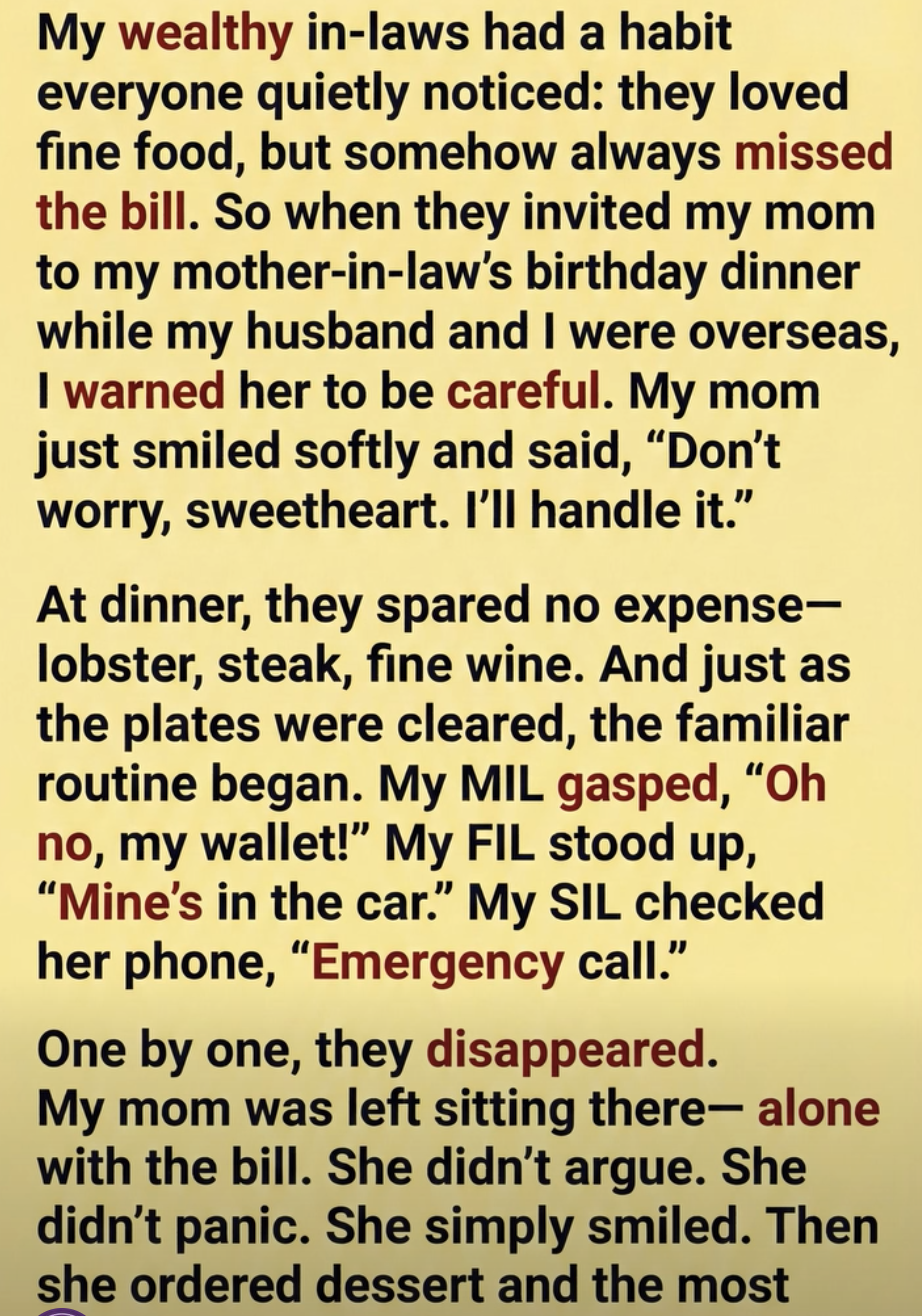 My wealthy in-laws had a habit everyone quietly noticed: they loved fine food, but somehow always missed the bill.