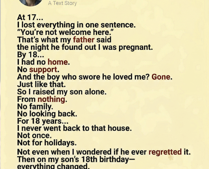 At 17, I lost everything in one sentence. “You’re not welcome here.” That’s what my father said the night he found out I was pregnant. No discussion. No second chance. Just a door closing behind me like I never existed. By 18, I had nothing. No home. No support. And the boy who swore he loved me? He disappeared within days. Just vanished, like responsibility was something he could outrun. So it was just me and my baby against the world.