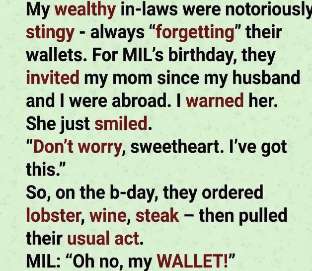 My wealthy in-laws were notoriously stingy. Not the obvious kind—the quiet, calculated kind. The kind that would order the most expensive items on the menu, laugh the loudest at dinner, and then suddenly “forget” their wallets when the bill arrived. It was almost a ritual. Someone else always ended up paying.