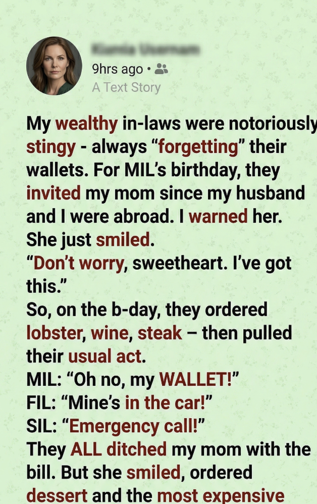 So when my mother-in-law planned her birthday dinner at an upscale restaurant and invited my mom—while my husband and I were abroad—I immediately felt uneasy. I called my mom and warned her. I explained everything. The tricks, the timing, the fake emergencies. I told her exactly what they would try to do.