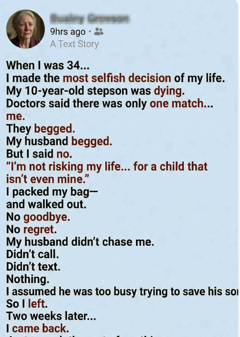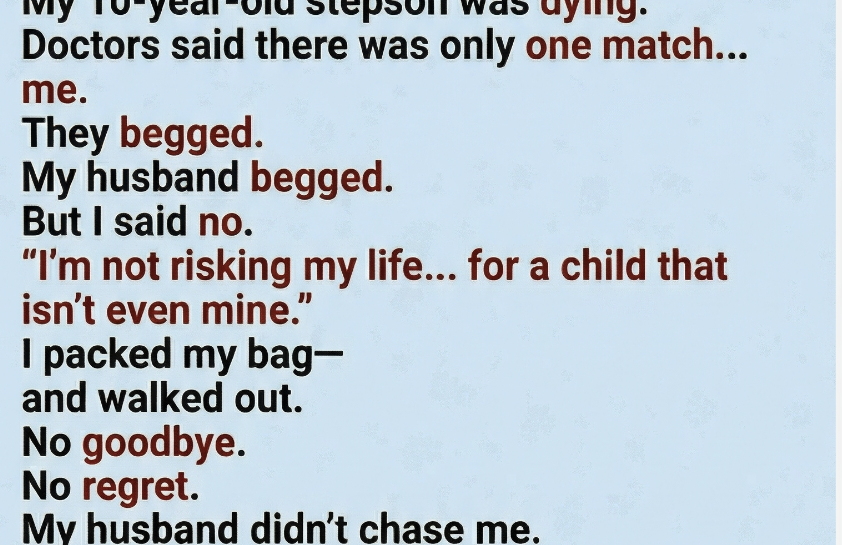 When I was 34, I made a decision I told myself I could live with. My 10-year-old stepson was dying. The doctors had been clear—his condition had progressed faster than anyone expected, and a bone marrow transplant was his only real chance. They ran tests on family members, searching for a match. One by one, the results came back negative. Until mine.