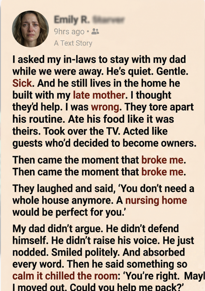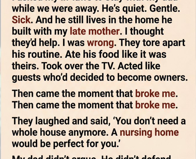 I asked my in-laws to stay with my dad while we were away. He was quiet, gentle, and not in the best health. He still lived in the home he built with my late mother, a place filled with memories, routines, and the kind of silence that only comes from loss. I thought they would help him. Keep him company. Make things easier.