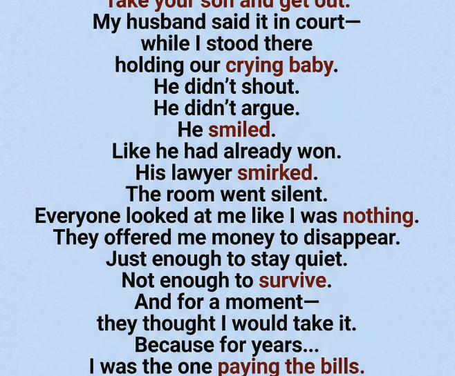 My husband looked straight at me in court and said, “Take your son and get out.” He didn’t raise his voice. He didn’t sound angry. He smiled. I was standing there holding our crying baby, feeling every eye in that courtroom judging me like I was nothing. His lawyer smirked like this was already over, like they had rehearsed every second of this moment and knew exactly how it would end. They offered me money to disappear, just enough to stay quiet, not enough to survive. And for a second, I understood what they thought of me—a woman who had spent years holding everything together but would still walk away with nothing.