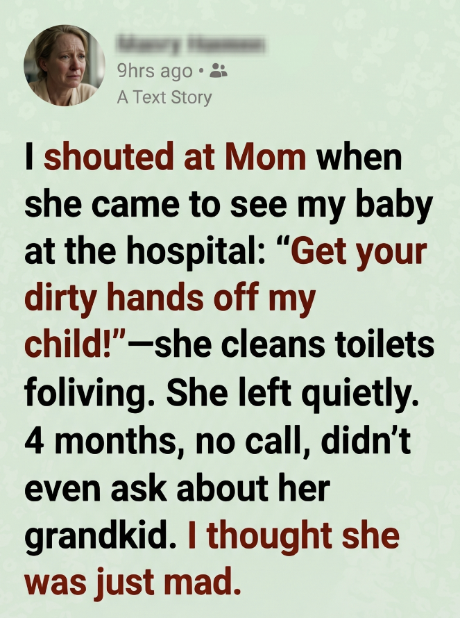 At the time, I felt justified. Exhausted. Overwhelmed. Ashamed in ways I didn’t know how to name. My mother cleaned toilets for a living—office buildings, train stations, anywhere that needed someone invisible to scrub away other people’s messes. I had spent years pretending that didn’t bother me. But there, in that pristine hospital room, holding my perfect baby, all my buried resentment spilled out in one unforgivable sentence.