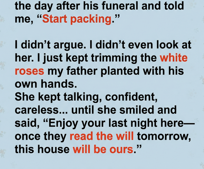 My ex-husband’s new wife showed up at my father’s house the day after his funeral and told me, “Start packing.” I didn’t argue. I didn’t even look at her. I just kept trimming the white roses my father planted with his own hands. The garden still smelled like fresh soil and grief, and it felt like the only place I could breathe. She kept talking, confident and careless, like everything was already hers. “You’ve had your time here,” she said. “Once they read the will tomorrow, this house will be ours.” That’s when I finally looked up, because she had just made the one mistake that would undo everything.