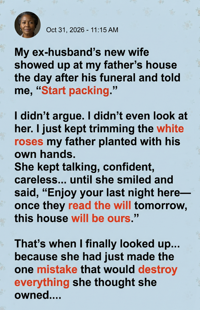 My ex-husband’s new wife showed up at my father’s house the day after his funeral and told me, “Start packing.” I didn’t argue. I didn’t even look at her. I just kept trimming the white roses my father planted with his own hands. The garden still smelled like fresh soil and grief, and it felt like the only place I could breathe. She kept talking, confident and careless, like everything was already hers. “You’ve had your time here,” she said. “Once they read the will tomorrow, this house will be ours.” That’s when I finally looked up, because she had just made the one mistake that would undo everything.