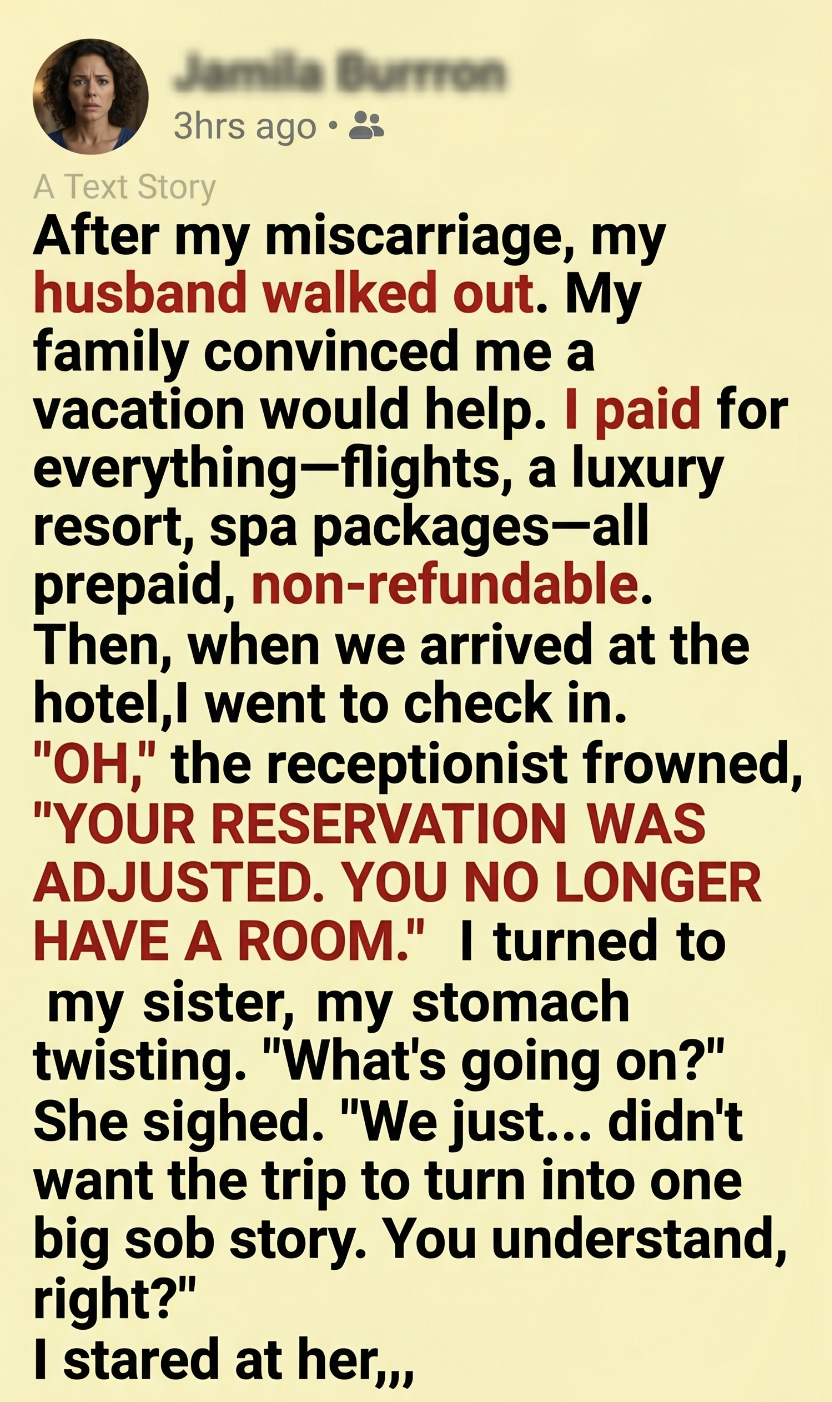 My sister was at the front desk, laughing, holding a drink, already settled into the vacation she had taken from me.