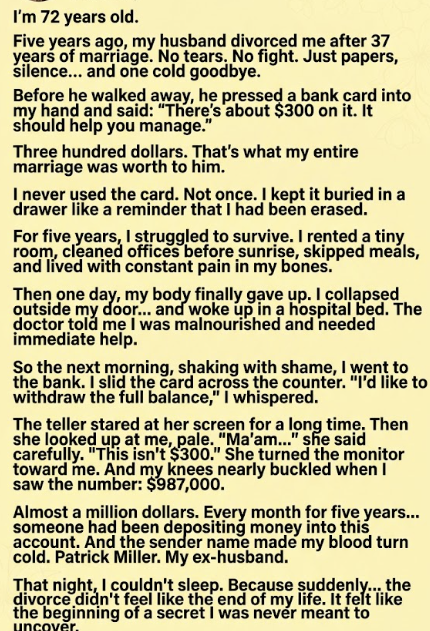 “He opened that account in your name,” she continued. “Set up automatic deposits. Told me never to tell you unless…”