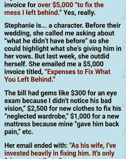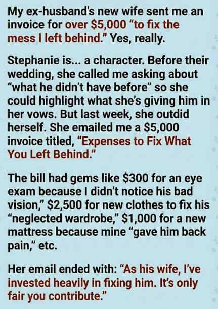 I had been divorced from Matt for two years. Life had moved on—or so I thought. Then his new wife, Stephanie, decided to send me a bill for everything she thought I’d “broken” in Matt’s life.