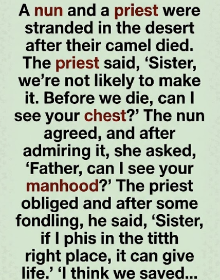 A nun and a priest were stranded in the desert after their camel died.
