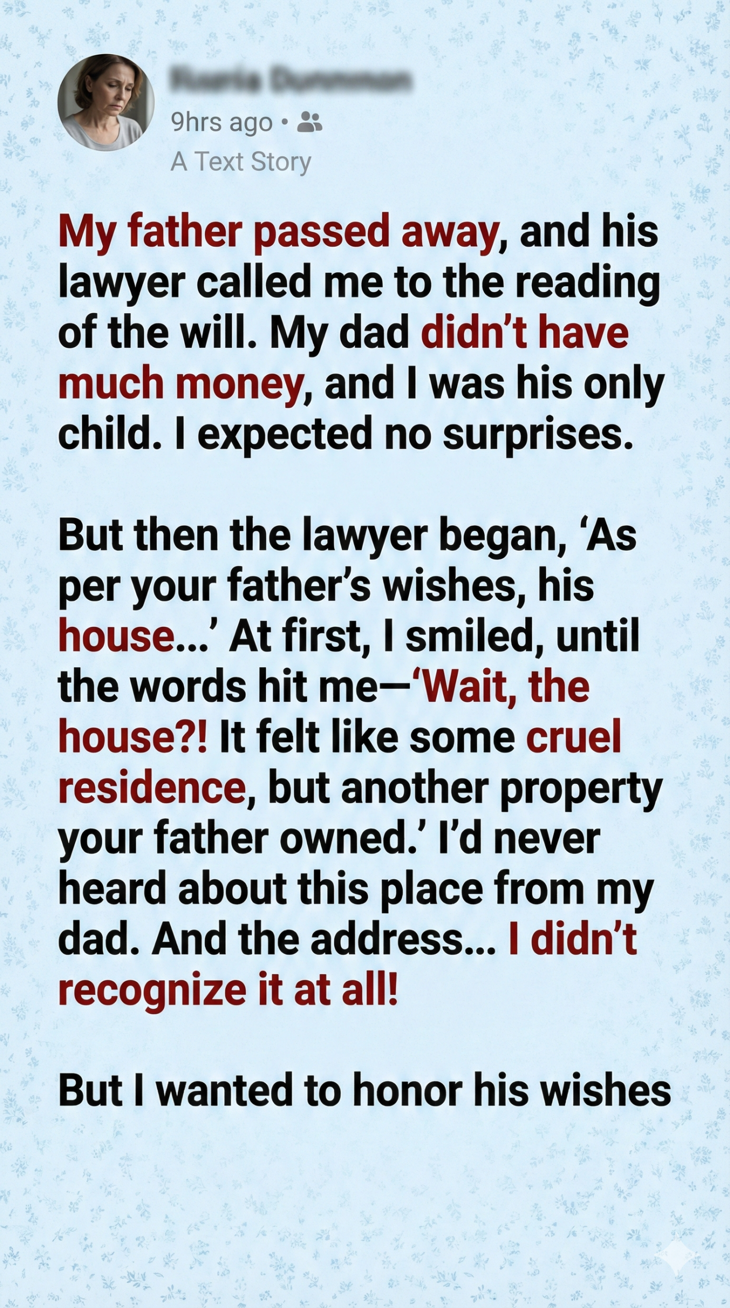 She reached out, gently taking my hand. Her skin was warm, soft. “Please,” she interrupted, her grip surprisingly firm. “Just… come inside. We need to talk. Your father… he wouldn’t have wanted you to stand out here.”
