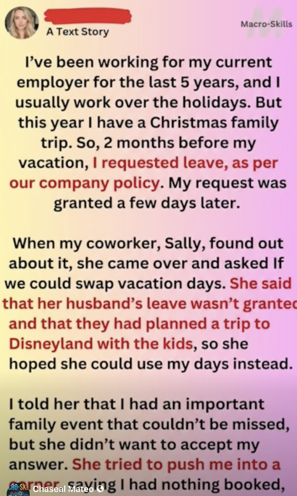 When my coworker, Sally, found out about it, she came over and asked if we could swap vacation days. She said that her husband’s leave wasn’t granted and that they had planned a trip to Disneyland with the kids, so she hoped she could use my days instead.