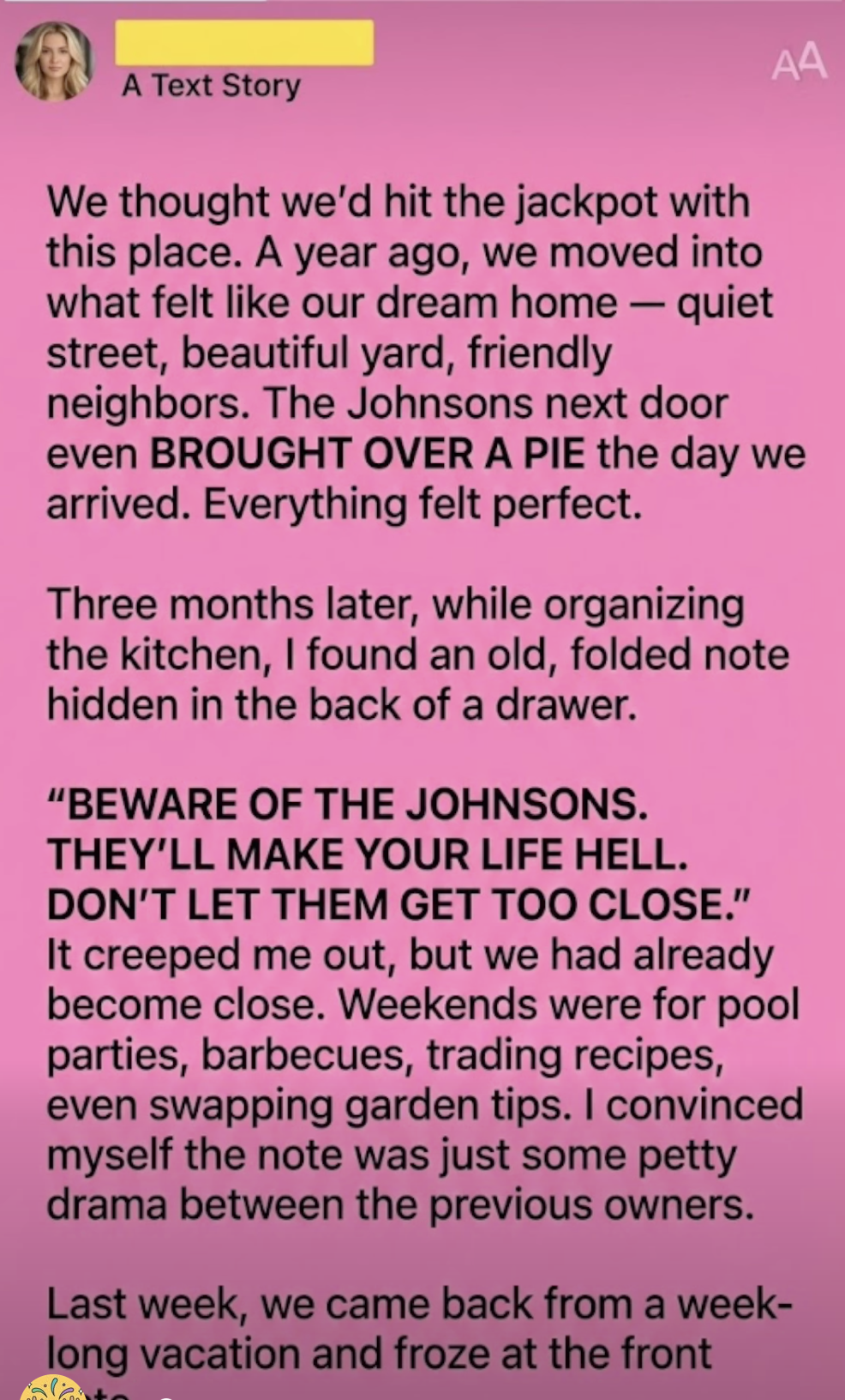 We thought we’d hit the jackpot with this place. A year ago, we moved into what felt like our dream home — quiet street, beautiful yard, friendly neighbors. The Johnsons next door even BROUGHT OVER A PIE the day we arrived. Everything felt perfect.